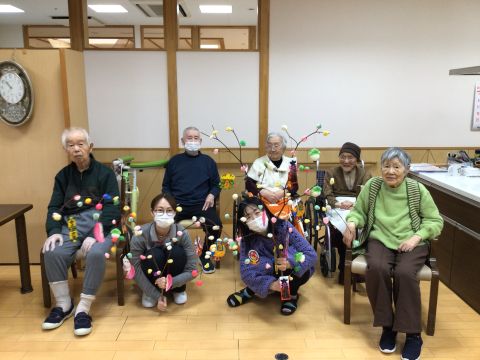 友愛の家では、暖かい室内でみずき飾りを作...